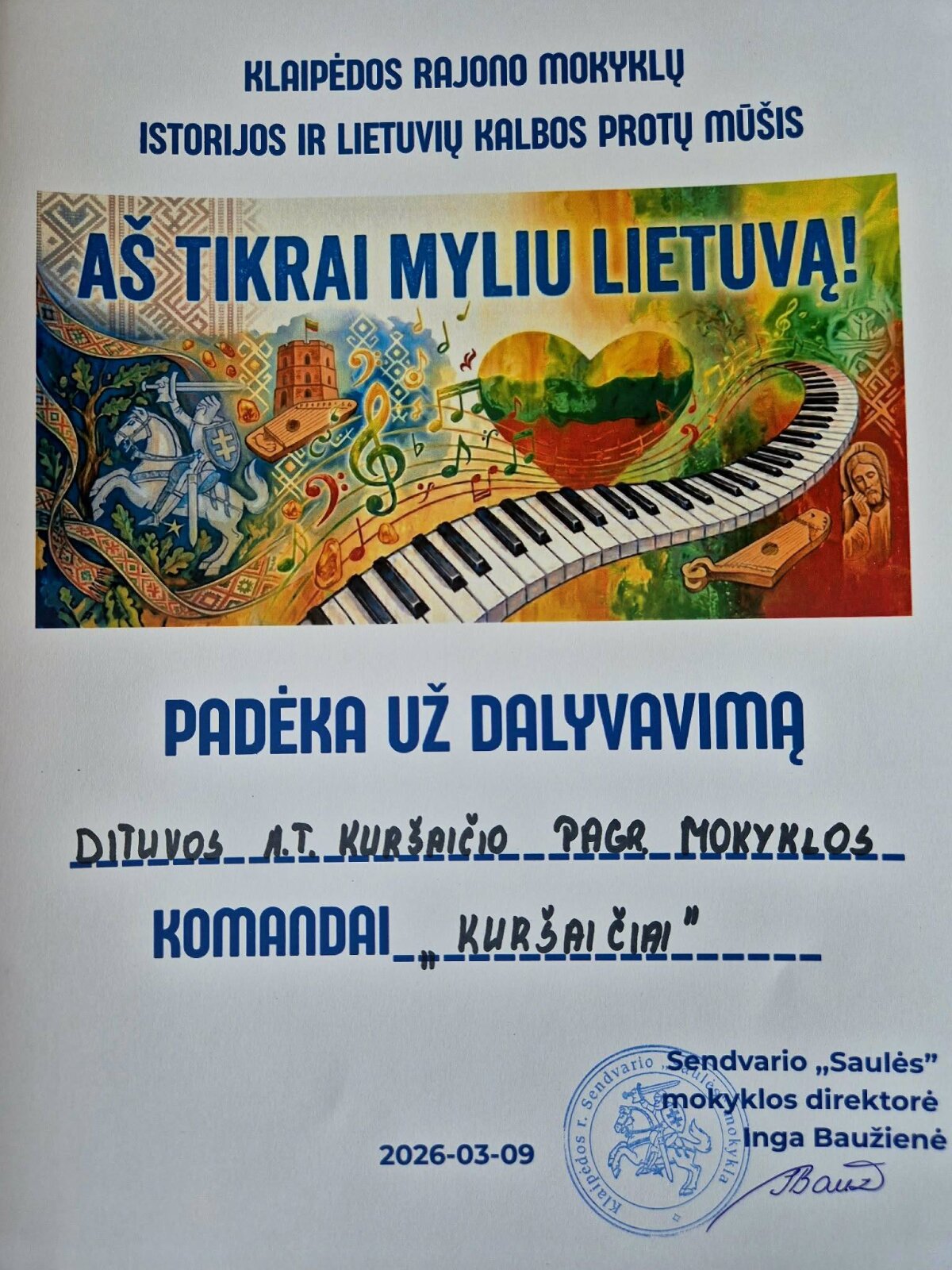 Klaipėdos rajono Sendvario "Saulės" mokykloje vyko integruotas istorijos ir lietuvių kalbos protų mūšis, skirtas Lietuvos nepriklausomybės atkūrimo dienai paminėti. Mūsų mokyklą atstovavo aštuntos klasės mokiniai Arijus Kornelijus ir Matas, septintos - Auksė J. ir Auksė V., šeštos - Danielė ir Justas, penktos - Marta ir Eivinas. Mokinius ruošė istorijos mokytoja Daiva.